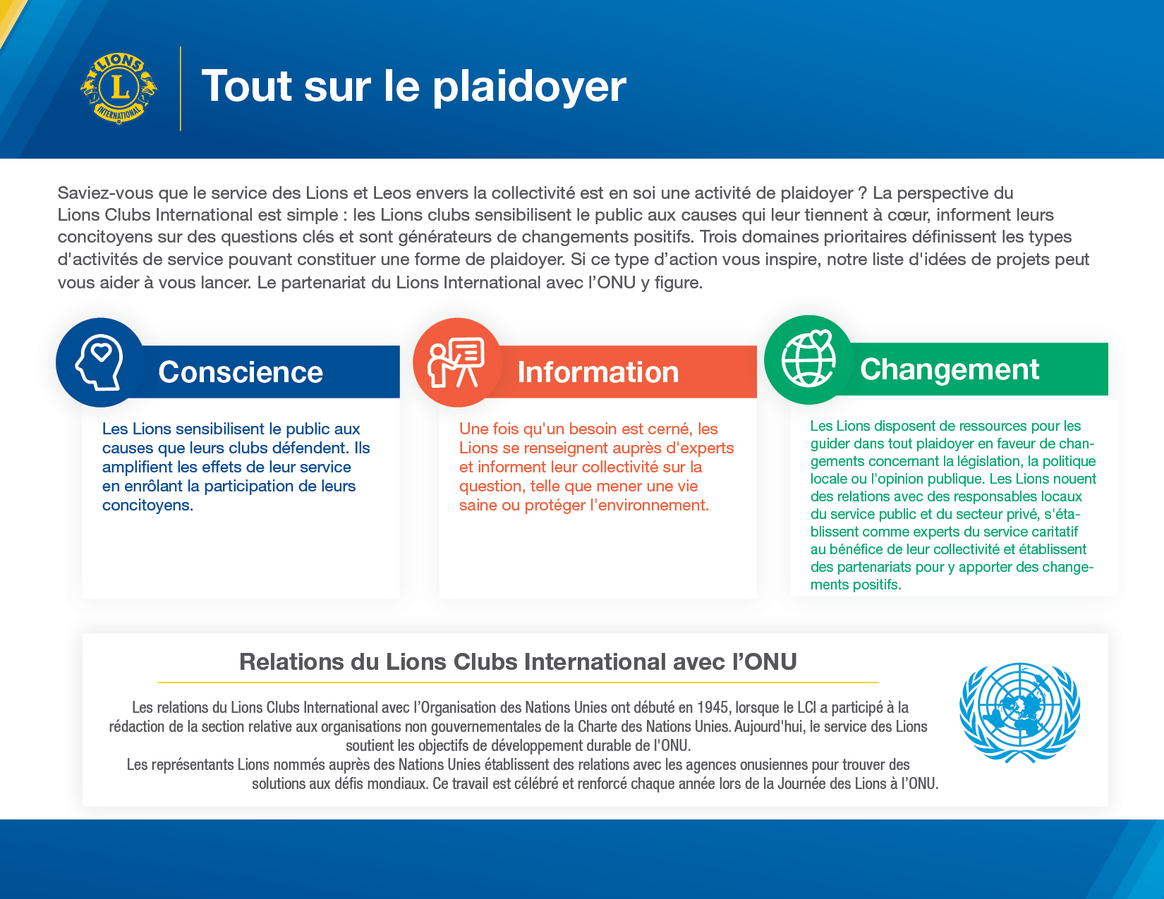 Le plaidoyer peut prendre des formes variées. Lions et les Leos en font à chaque fois qu’ils sensibilisent le public aux causes qui leur tiennent à cœur, informent leurs concitoyens sur des questions clés, ou sont générateurs de changements positifs. L’infographie Stratégie de plaidoyer Lions vous en apprendra plus sur le sujet et peut servir de source d’inspiration en matière de projets de service liés à chaque pilier de notre stratégie. Faites-la connaître aux membres de votre club lors de votre prochaine réunion.