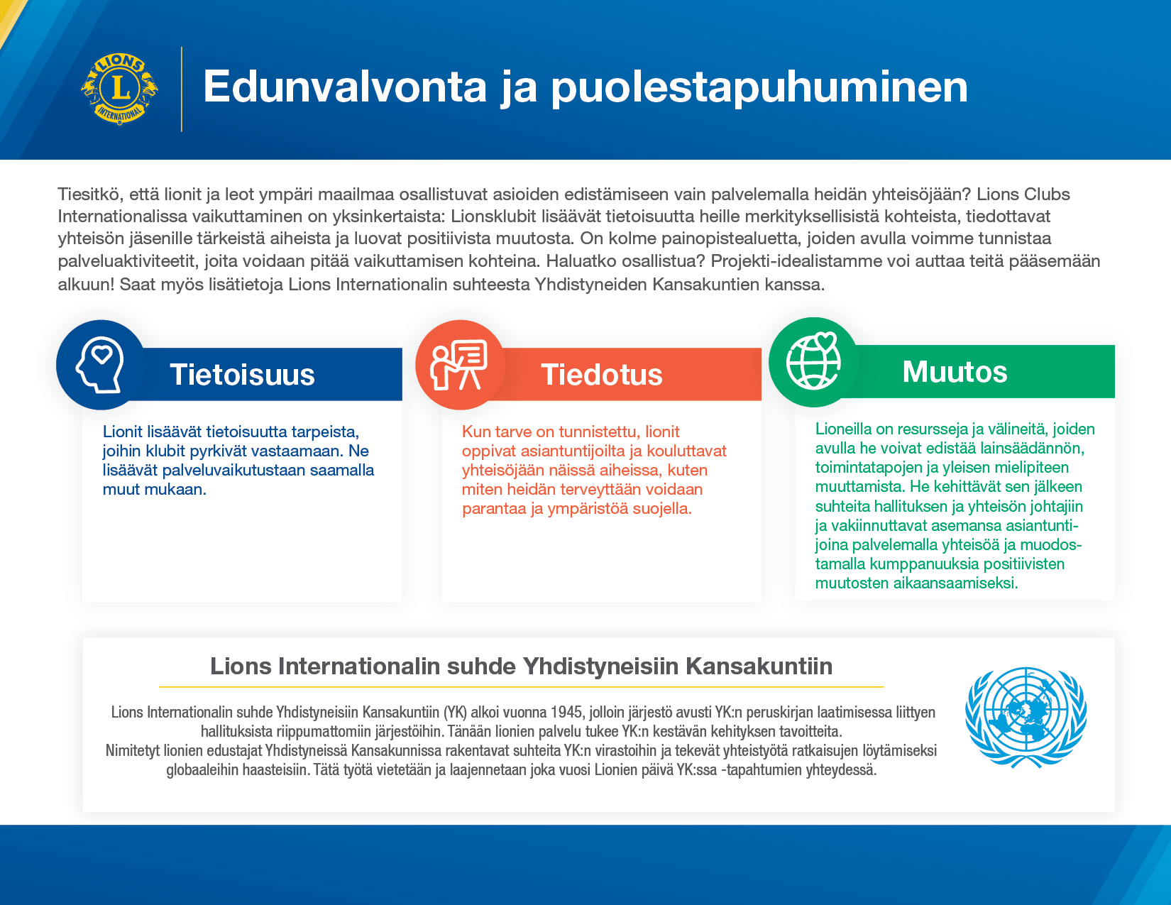 Lionit ja leot osallistuvat edunvalvontaan aina, kun he lisäävät tietoisuutta heille merkityksellisistä kohteista, tiedottavat yhteisön jäsenille tärkeistä aiheista ja luovat positiivista muutosta. Löydät inspiraatiota ja lisätietoja lionien suorittamasta edunvalvonnasta lataamalla edunvalvonnan strategisen kuvauksen — tämä on hyödyllinen työkalu, joka auttaa palveluprojekti-ideoiden suunnittelemisessa jokaisen eri strategian kohdalla. Jaa se klubin jäsenten kanssa seuraavassa kokouksessa!